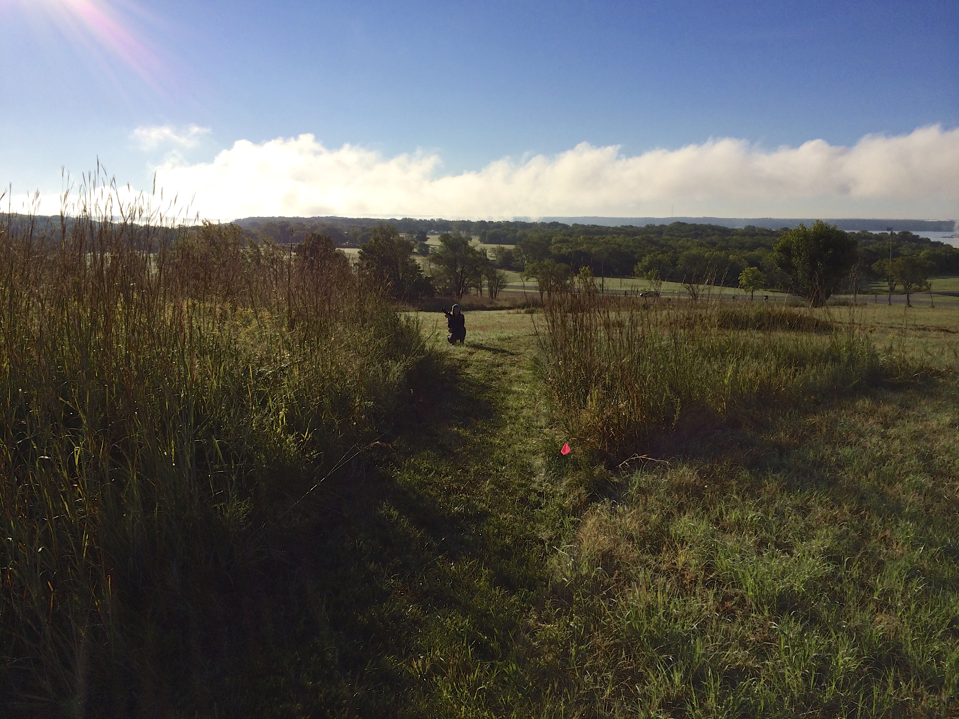 Standing around the fire-pit pre-race was almost mandatory. At under 40 degrees, it was cooler in the Kansas plains in late Summer than the Colorado mountains in late Spring. Almost freezing in fact. Perfect for a long run but plenty chilly for standing around. After finishing a plate of hot food and another round of hotter coffee while chatting around the fire it was time to really get ready. Fumbling with pins in the cold I again cursed my cheapness for not staying the night before and attending packet pickup. We marched out of the cook-pot and fire-pit warmth of the shelter, piercing the darkness with dozens of headlamps pointing toward the start line. I missed all the pre-start instructions and incorrectly figured they didn’t much matter, as I’d start solidly in the back with few aspirations of moving up. It seemed the key relevant point to remember was avoid all double-striped trails. It’d be 90 minutes before enough light made its way through the towering hickory and oak trees to see; trail markings rarely crossed my mind once we started.