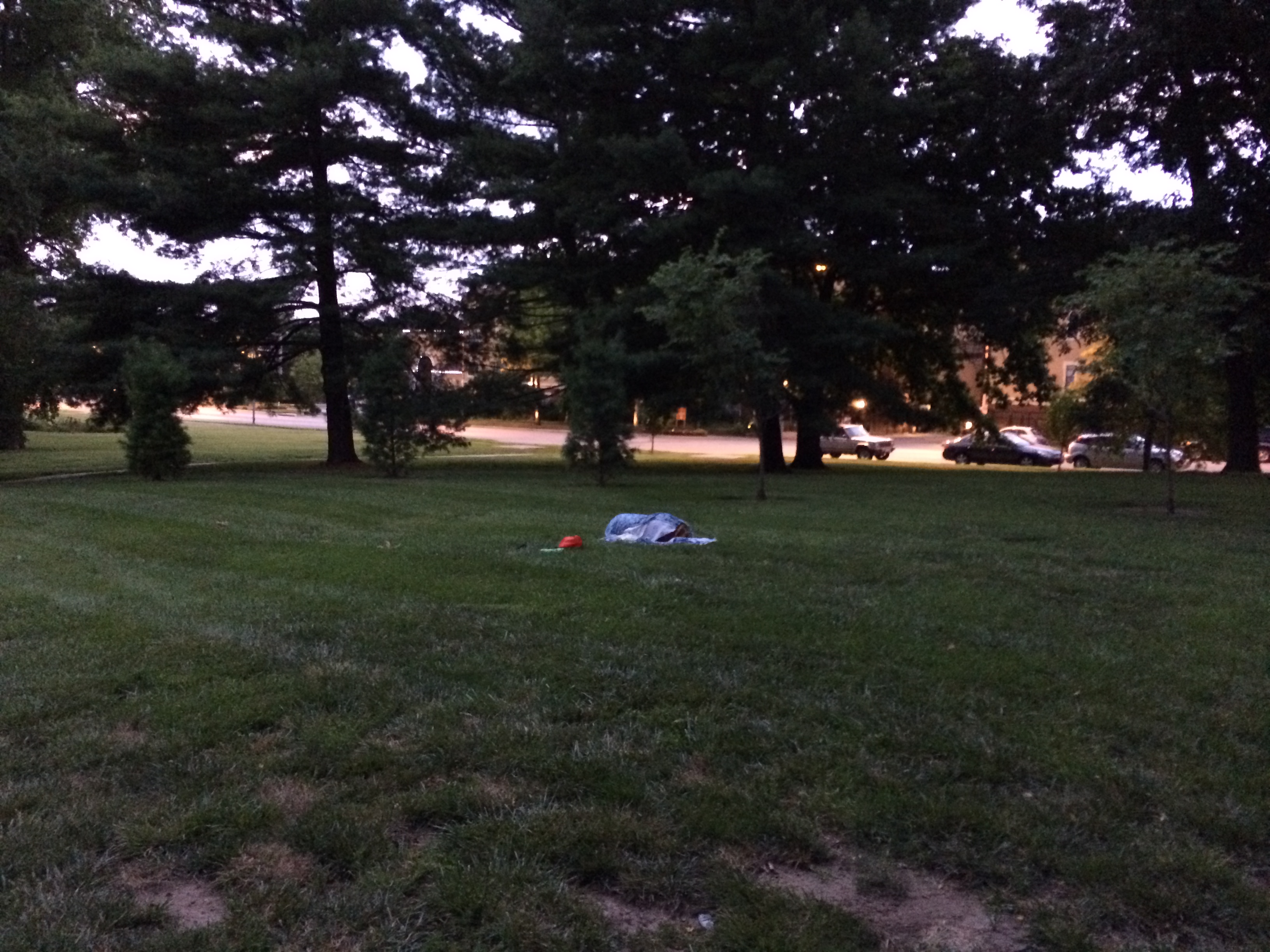 Samantha doesn’t scare easily. She startles rather easily but doesn’t scare lucky for me. As I continued to tug at Tucker to convince him my feet were soaked and the piney branch would be there later, as in after the sun came up and it dried out, Sam continued to crouch and crawl under another branch of the same tree. Suddenly she jumped back with a combination of a yelp, bark and growl. Equally as startled I tugged them both toward the flickering street light, nearly tripping over a pair of men’s ankle-height shoes neatly lined up at one edge of the overhanging branches. Heart-rate back under control I peered under the canopy, in toward the trunk and made out the image of a shadow; mostly likely a blanket or thin coat given the late summer warmth. Continuing my tug I picked up our pace toward the street, knowing we’d likely disturbed the occupant’s early morning sleep.